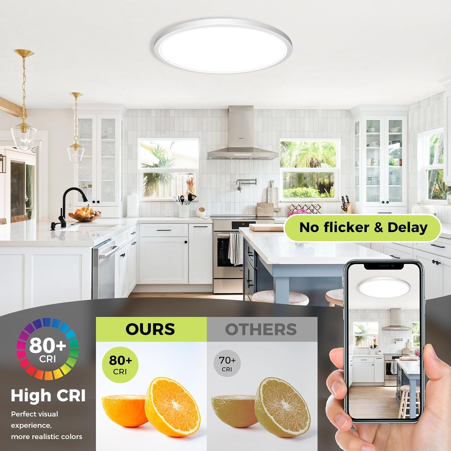 【Energy-saving and Durable】With 24W power and 3200LM brightness, equivalent to a 150W*2 incandescent bulb, this low profile ceiling light has low energy consumption and a long lifespan of up to 30,000 hours, which reduces your electricity bill and frequent replacements, and provides you with an energy efficient lighting solution.